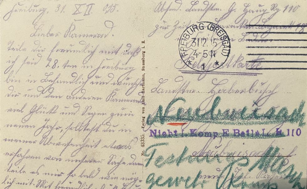 Der Absender ist mir unbekannt und war wahrscheinlich ein Kamerad von ihm, der sich im Lazarett in Freiburg befand. Was mit der Sache gemeint war werden wir wohl nie erfahren.